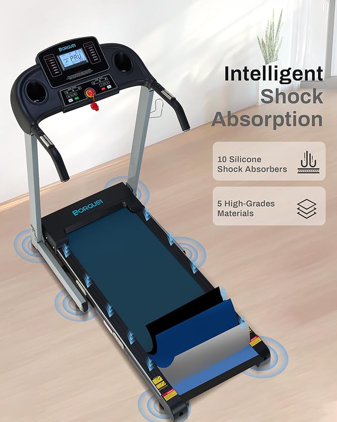 - 【Widened Intelligent Shock Absorption】 43.5" x 17.5" large running track to fit different users‘ stride lengths. Built-in 10 shock absorbers. 5 layers of non-slip running belt, and shock absorbers cushion your knee, muscle, and joints.