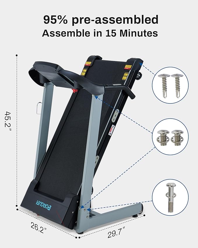 - 【Easy Assembly & Space Save】Our running treadmill is 95% pre-installed, just need a few screws, to complete the installation. Our treadmill can fold up after your run for compact, simple storage.