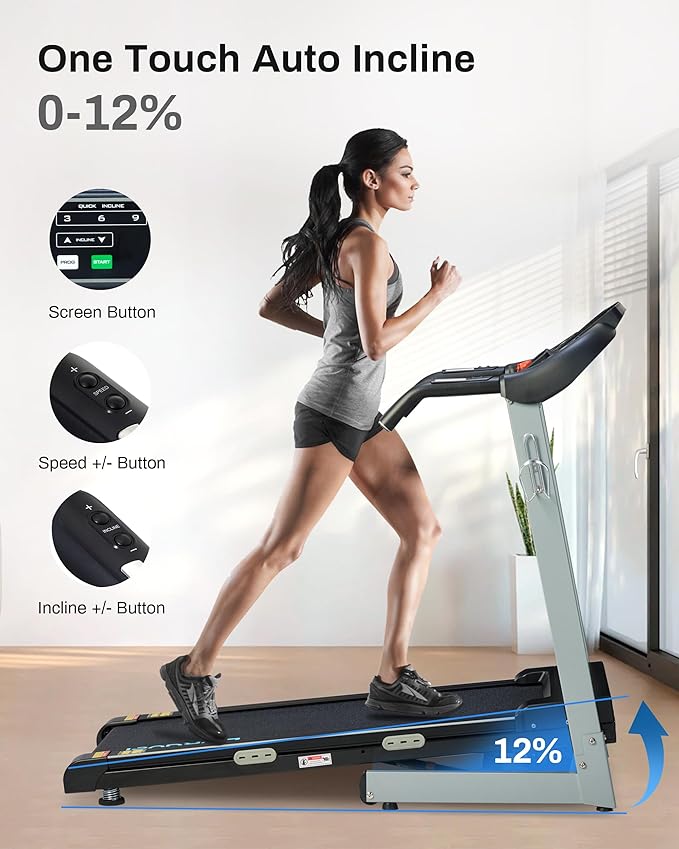- 【0-12% auto incline & Speed Control】 Incline treadmill achieves a personalized workout with customizable incline levels from 0% to 12%, and adjustable speed ranging from 0.5 to 8.5. Both incline & speed can easily be switched via the panel or quick keys on the handrail.