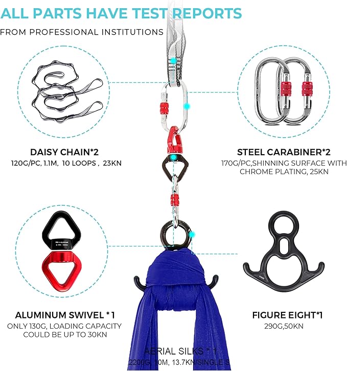 - 【SILK STYLE】This aerial silks products are made of Premium 40D Nylon Fabric that is easy to climb and can hold up to 1000 kilograms. Our Aerial Silk have undergone strict testing and certification to ensure that there are no safety hazards during use. At the same time, we provide detailed instructions and operation videos to make you feel more at ease when using them.