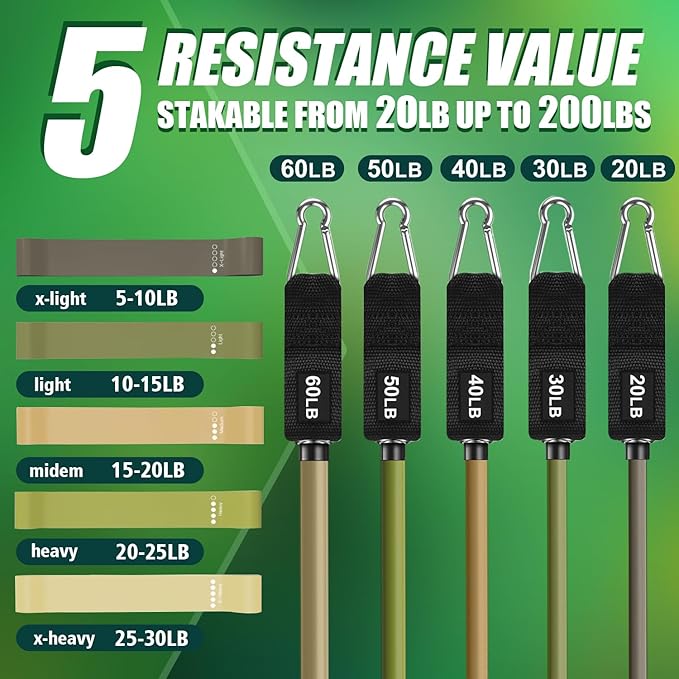 - DIFFERENT COLOR ADJUSTABLE RESISTANCE BANDS: The exercise bands come with 5 different resistance level 20lbs, 30lbs, 40lbs, 50lbs and 60lbs in 5 different colors, and and can be used alone stacked in any combination to a maximum equivalent of 200 lbs