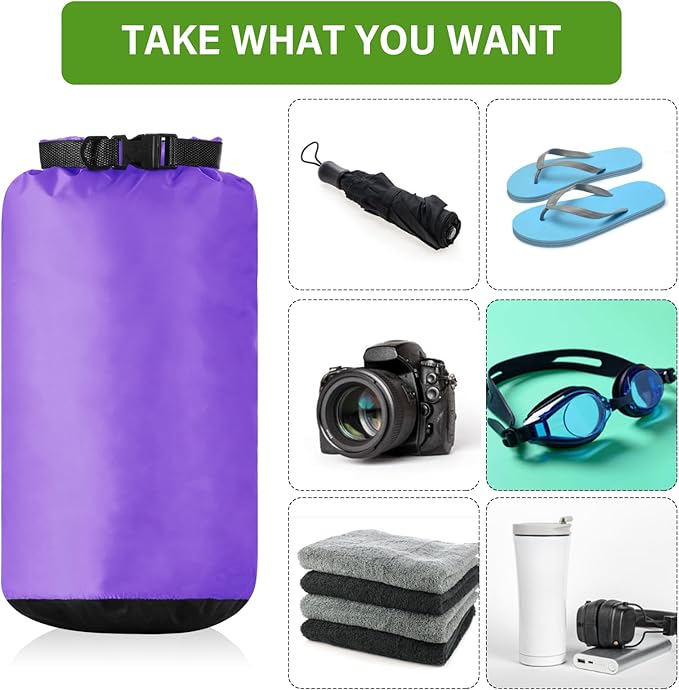 - Good Waterproofing Function: our dry bags are meticulously designed with roll top closure and a ring to securely enclose your equipment; They proficiently repel rain, and other liquids (does not include when completely submerged in water), and also prevent intrusion of mud and sand; It keeps your valuables dry and safe when you're caught in a rainstorm