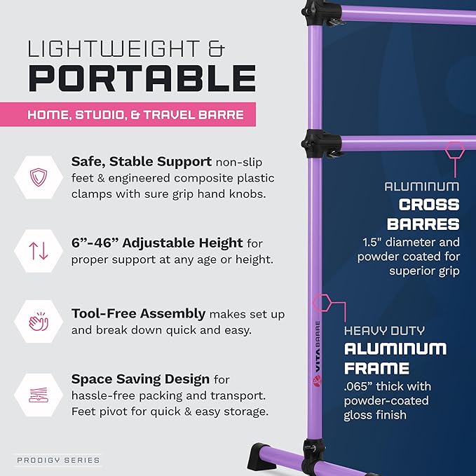 - Portable and Adjustable The Prodigy Portable Freestanding Barre features double bars, 1.5 diameter, which are fully height adjustable from 6 - 46 to create the perfect personalized workout or dance experience. This Barre is perfect for your dance routines.