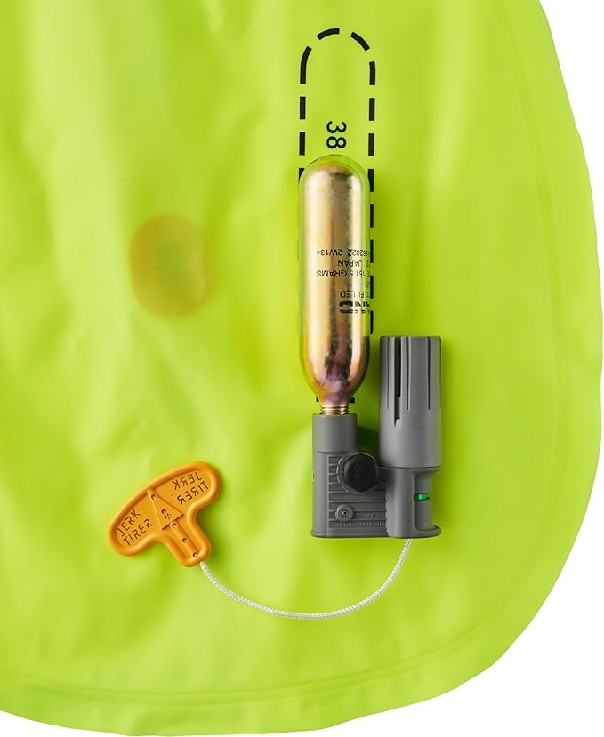 - US COAST GUARD-APPROVED TYPE II PERSONAL FLOTATION DEVICE (PFD): This type 2 life jacket is designed to turn the wearer face-up in water. The life vest inflates automatically upon water immersion via a replaceable CO2 cylinder (includes 1 cylinder with purchase) or manually with a pull of the “jerk to inflate” cord or back-up oral inflation tube. Designed for commercial fisherman in mind this vest brings superior safety and performance to the recreational water enthusiast.