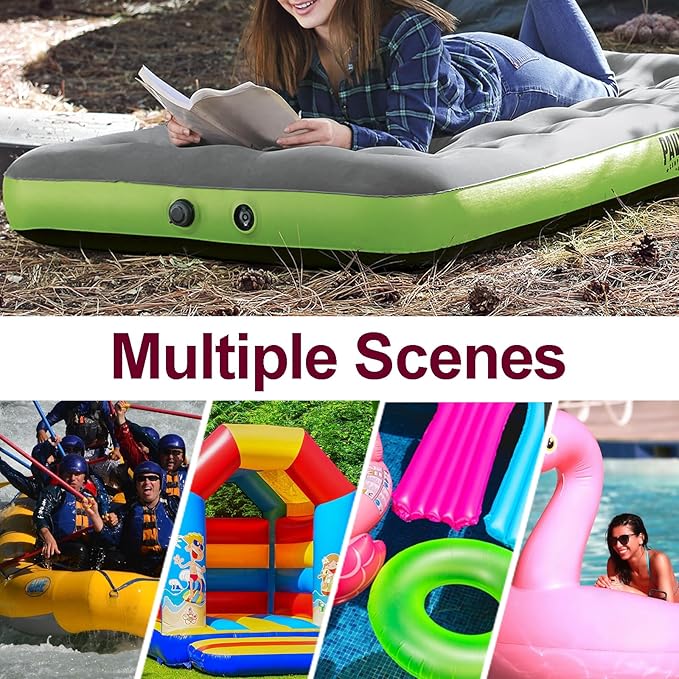 - Wildly Usage: With high power, quick fill and large air flow, work well with air mattresses, pool floats, rafts, air sofas, air beds, bathtub, boat, pool toys, swimming rings etc. The unit also is well suitable for air mattress spare pump or household vacuum compressed bag.