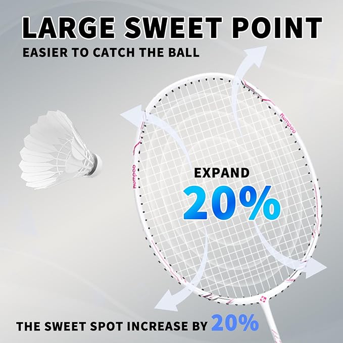 - ✨Perfect Design Details: The badminton racquet with a one-piece design outside and a built-in T-joint inside, ensuring sturdy construction and more stability during gameplay. The enlarged and widened racket surface has a larger sweet spot, enhancing hitting efficiency. The all surrounding wire trough design effectively prevents wire breakage caused by impact or wear.