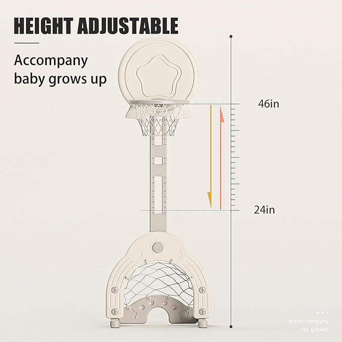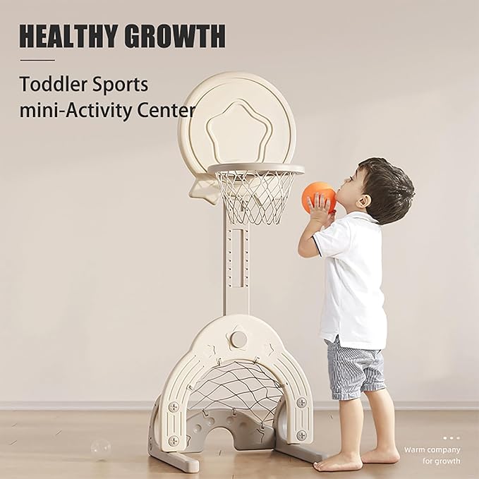 - 3-in-1 Activity Center: Your little one will have a toweringly good time as they learn to slam dunks and smash free kicks with our uproariously interactive activity center. This kids' basketball hoop has three sports to play, including golf, basketball, and soccer goal game. The basketball hoop set you purchased will come with 1 basketball,1 soccer ball, 1 golf ball, and 1 golf club. By playing by themselves or with friends, children can gain unlimited joy and develop motor skills!