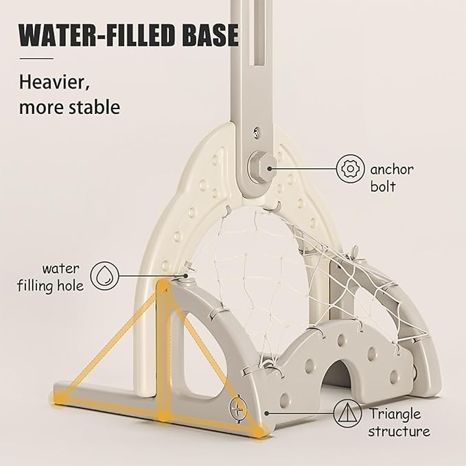 - Stable Triangle Structure: The Triangular structure base effectively increases the stability of the entire toddler basketball hoop and can prevent children from being injured. In addition, there is a piston on the base of the basketball hoop for toddlers. After opening it, you can fill water or sand to increase the stability of the base