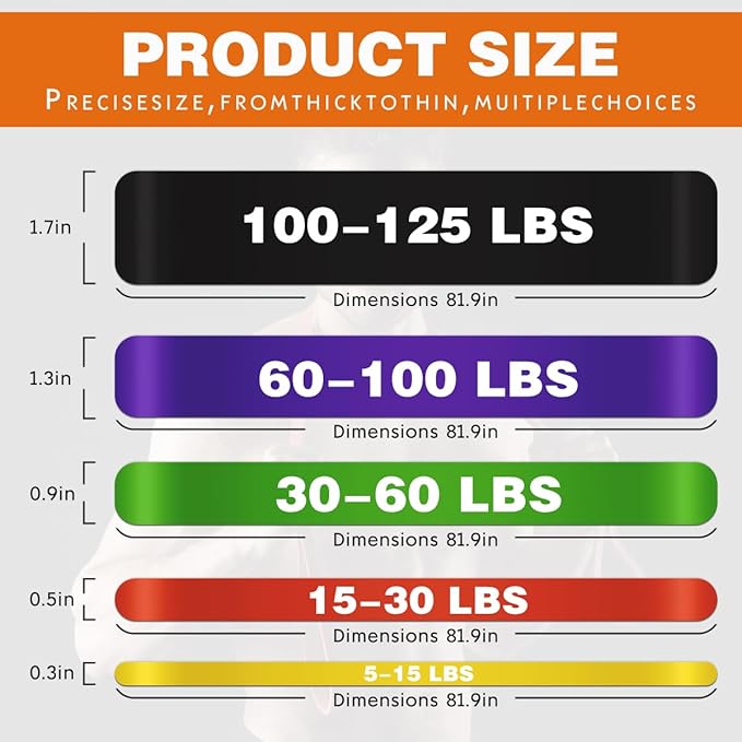 - 【Product Specifications】The set contains Five different colors representing different pounds, including four pieces: Yellow (5lb-10lb) Width: 0.25in, Red (15lb-30lb) Width: 0.51in,Green (30lb-60lb) Width: 0.82in, Purple (60lb-100lb) ) Width: 1.25in,Black (100 lb-125lb) width: 1.7in