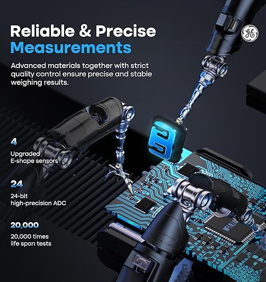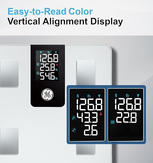 - Extensive Body Metrics Tracking: The GE Fit Plus Smart Body Fat Scale offers a detailed analysis of nine vital health metrics, including body weight, body fat percentage, muscle mass, body water, visceral fat, fat-free body weight, BMI, BMR, and bone mass. All data is seamlessly transmitted to your smartphone via Bluetooth, aiding you in achieving your health objectives more efficiently