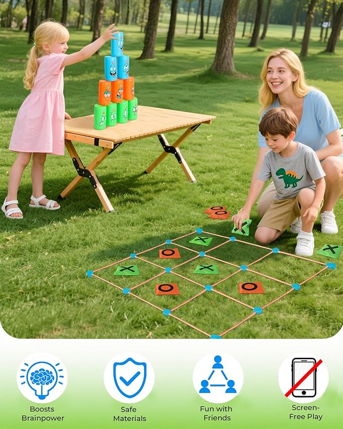 - 2-in-1 Outdoor & Indoor Game Set – Enjoy double the fun with our giant tic-tac-toe & can toss game! This exciting combination allows kids, families, and friends to enjoy endless throwing challenges at home, in the backyard, at parties, or in classrooms.