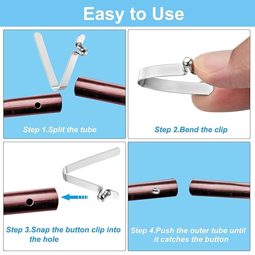 - Instruction: Bend the clip, put the clip into the rod, snap the button clip into the hole, and push the outer tube until it catches the button.