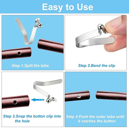 - Instruction: Bend the clip, put the clip into the rod, snap the button clip into the hole, and push the outer tube until it catches the button.