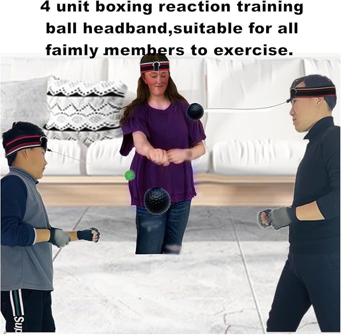 - 2,Boxing ball headband for kids and adults. It is suitable for parent-child interactive sports, physical exercise and training the reaction speed of hands and feet. Fix the other end of the rope on the boxing reaction ball on the headband, adjust the length of the number, and wear gloves.