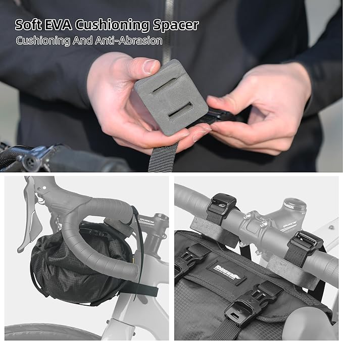 - The fabric is resistant to water pressure of 4000MM, and is equipped with hot-pressed waterproof tape inside to resist rainwater penetration. 4 EVA soft pads are provided, which can reduce vibrations on bumpy roads and prevent friction on the handlebar paint surface.