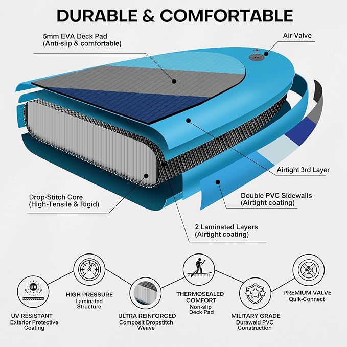 - Premium Military-Grade Construction: The inflatable SUP made of drop-stitch core and double PVC material for exceptional rigidity and puncture resistance, resists deformation under 350 lbs load. UV-resistant & thermosealed layers ensure long-lasting durability for ocean, lake, and river adventures.
