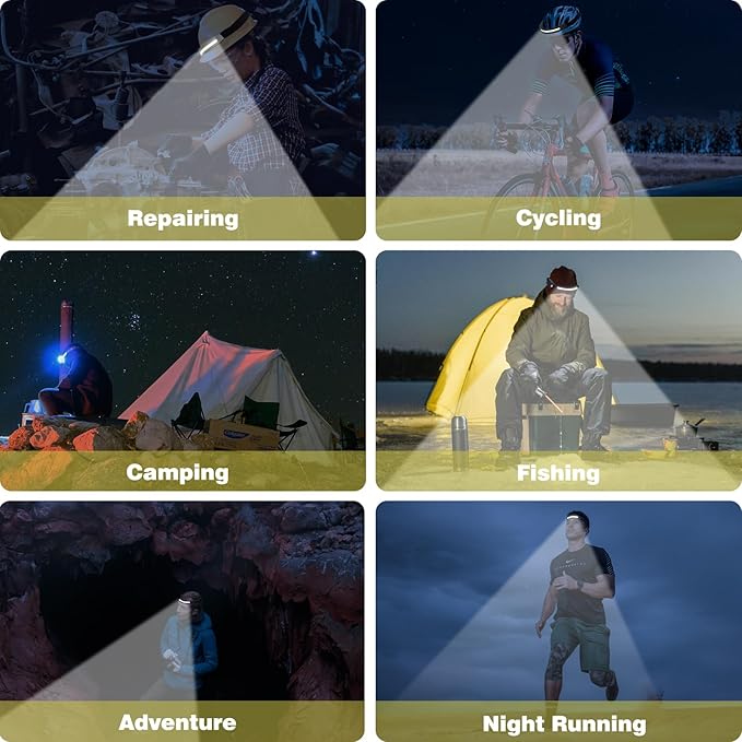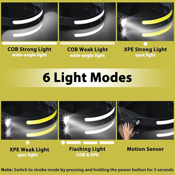 - 6 Adjustable Lighting Modes: Head lamps can switch between 5 different working modes - COB high mode, COB low mode, XPE high mode, XPE low mode and flashing mode. Pressing the power button, you can select the lighting mode of headlamps according to different usage scenarios, and long press to turn on the flashing mode.