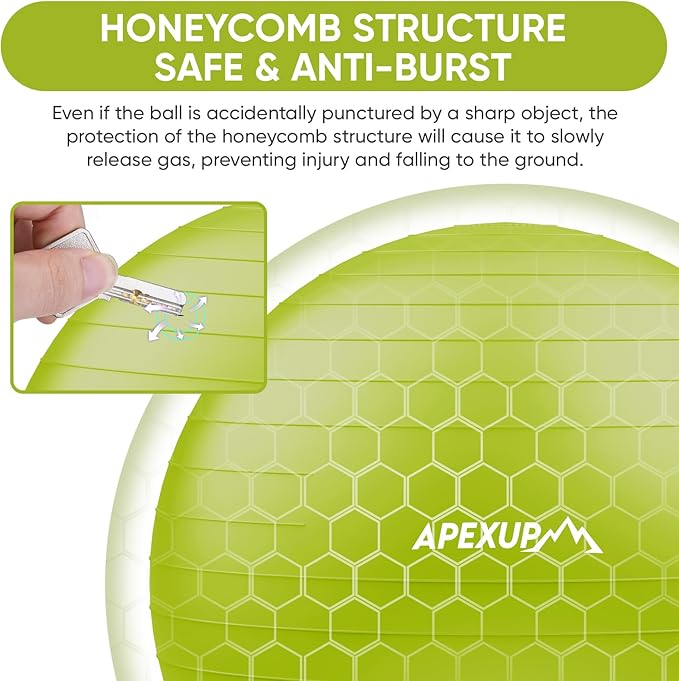 - [SAFE & ANTI BURST] APEXUP Exercise ball is made of high-quality, eco-friendly PVC material, which meets stringent safety standards. It's non-toxic, odorless, and free from harmful heavy metals. With an anti-burst honeycomb structure, it ensures durability and safety during your workouts.