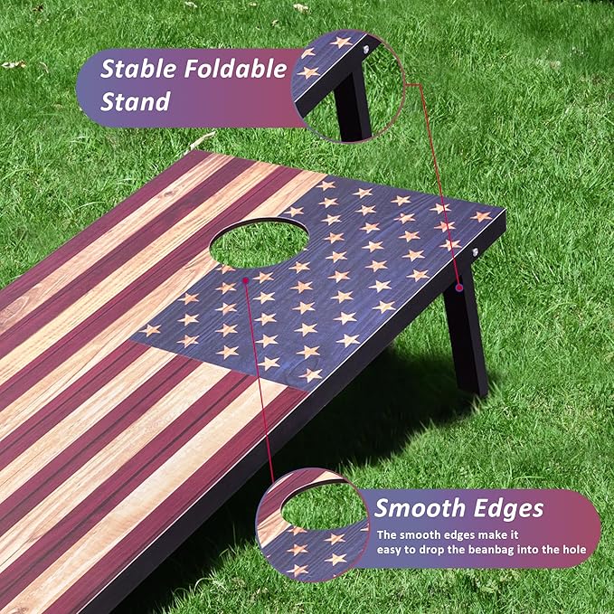 - [Sturdy Construction] - In order to provide a better playing experience, all official cornhole sets added extra wooden strips on the back of the board as support, and added anti-vibration gaskets to the bottom of legs, the double protection can better resist the impact of the bean bag during play games and family tournaments