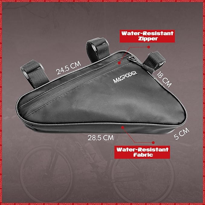 - Well made bike frame bag. With a capacity of 1.1L, the bike bag easily stores your emergency repair tools and personal items. Made from PVC water resistant fabric, this bike bag provides excellent tear resistance and is highly durable, not to mention water resistant in light rain. The bicycle bag also features a reflective design, enhancing safety during night rides. Plus, this bike repair kit comes with a mini tool bag to keep your tools organized and tidy.
