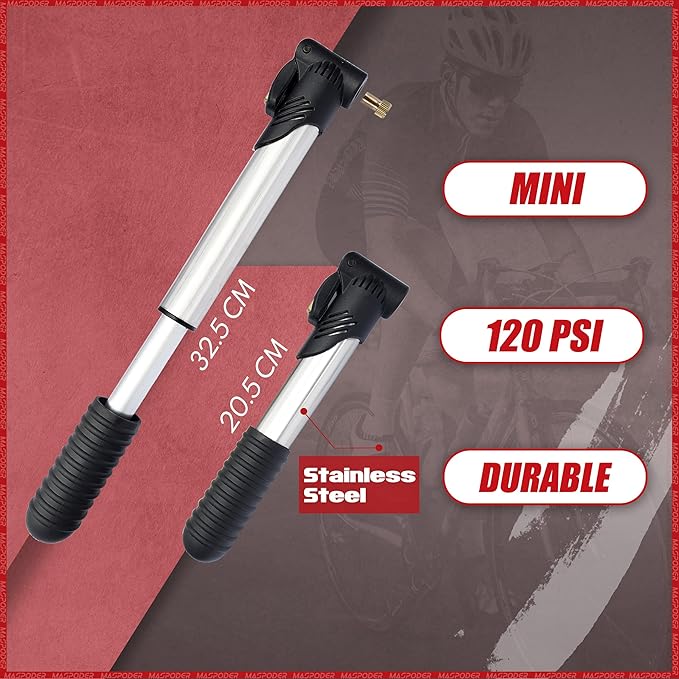 - Stainless Steel Bike Pump. This bicycle pump is made of stainless steel and plastic, making it sturdy and durable, and it comes with Presta & Schrader valve adapter. With a compact design of only 20.5cm in length, it is easy to carry and fits into most bicycle bags. Its pressure can reach up to 120 PSI, allowing you to quickly inflate your bike tire in case of an emergency.