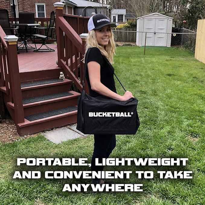 - PORTABLE! LIGHTWEIGHT! CONVENIENT! BucketBall is the ultimate tailgate game! BucketBall is portable, lightweight and convenient to take anywhere on the go. BucketBall weighs less than 11 pounds. When BucketBall is setup for game play, it is just as large as cornhole. However, when BucketBall is packaged inside it's tote bag, it takes up less than a cubic foot of space.