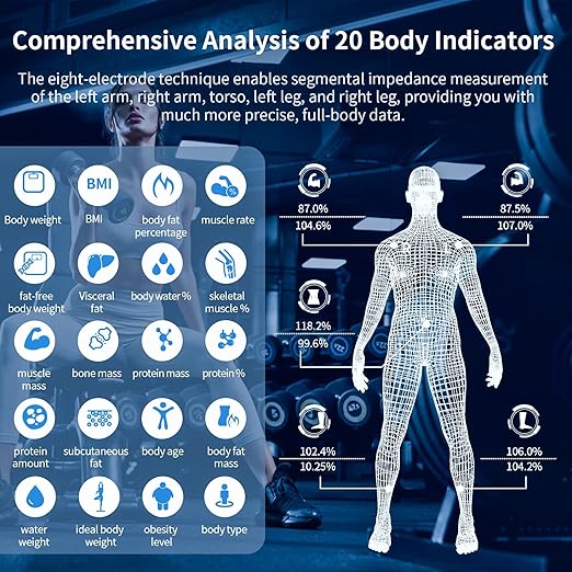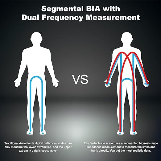 - 8-ELECTRODE FIVE-SEGMENT MEASUREMENT: Unlike other 4-electrode scales that only measure the lower body, our body composition scale uses advanced eight-electrode technology for segmented BIA measurement, providing the distribution of fat and muscle in five parts of the body (trunk, left upper arm, right upper arm, left lower limb, right lower limb), providing you with more detailed data. Helping you to conduct more effective targeted training.Compared to other body fat scales, ours is closer to actual body scan data