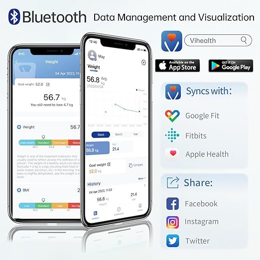 - 20 BASIC DATA ANALYSIS AND PROGRESS TRACKING: The body fat scale can accurately measure 20 body composition measurements including body weight, BMI, body fat percentage, water weight, muscle mass, bone mass, subcutaneous fat, visceral fat, etc. The app provides detailed graphs and trends of body status over days, weeks, months and even years.You can also share your fitness results to Apple Health, Google Fit, and Fitbit.get a body composition analysis report and , helping you to manage your physical conditions conveniently