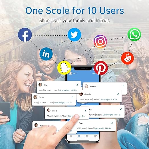 - ONE BODY SCALE FOR THE WHOLE FAMILY: This BMI smart scale allows you to create up to 10 member profiles in a single APP account. If the weight difference is within 2kg /4.4 lb. It can easily identify different users and automatically identify the results to their own profiles.The larger ITO film ensures that feet of different sizes can be measured, which is very suitable for families or fitness teams