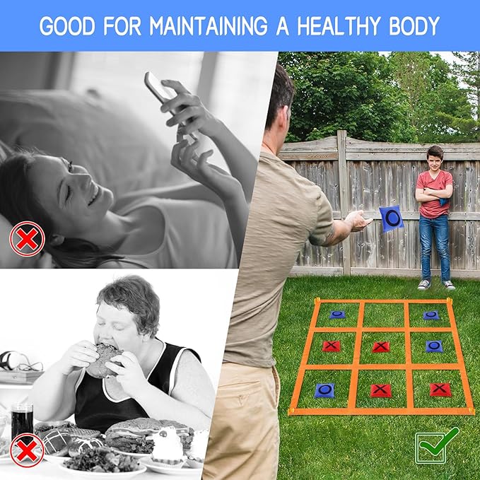- GIANT TIC TAC TOE GAME FOR ADULTS AND KIDS: Giant tic tac toe bean bag toss game is suitable for children over three years old or adults, you can play a variety of games, such as long-distance toss bean bag;tic tac toe;shuttle running;teamwork PK, etc. This large tic tac toe game set is also suitable for children and adults to enjoy this fun game together, encourage children to do physical exercise and interact with friends and parents, stay away from electronic products that hurt eyes