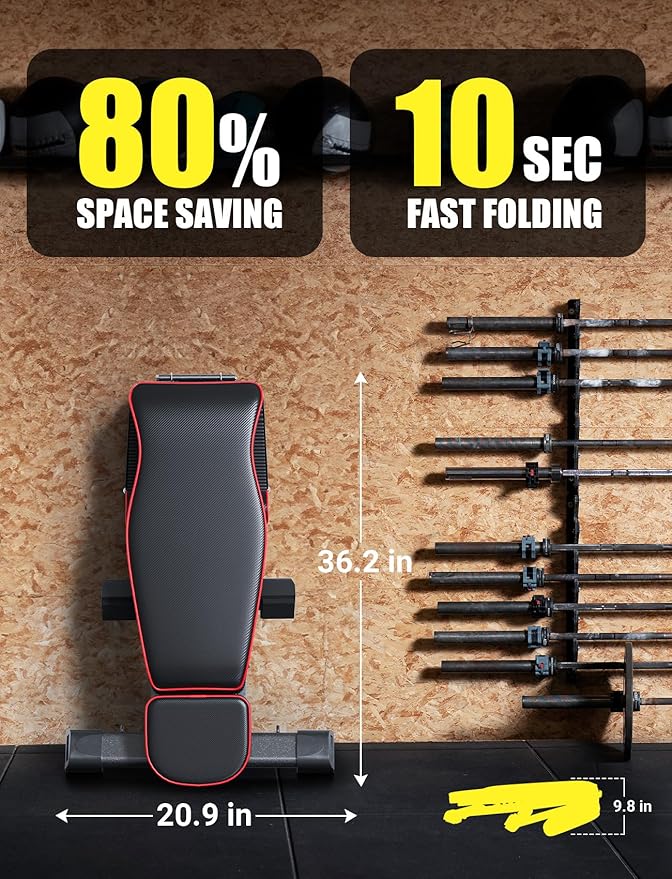 - 【𝟖𝟎% Space Saving】Measuring 36.2"L x 20.9" W x 9.8"H when folded, simply pull out 2 pins and lay down the backrest to store the foldable weight bench under the bed or around the corner, which will save up to 80% space in your home gym!