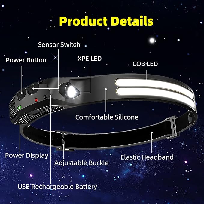 - Motion Sensor for effortless operation: Fumbling with buttons is a thing of the past with our Motion Sensor technology. Effortlessly control the headlamp with a simple wave of your hand. Enjoy the convenience of our gesture-sensing feature and say goodbye to any operational hassle.