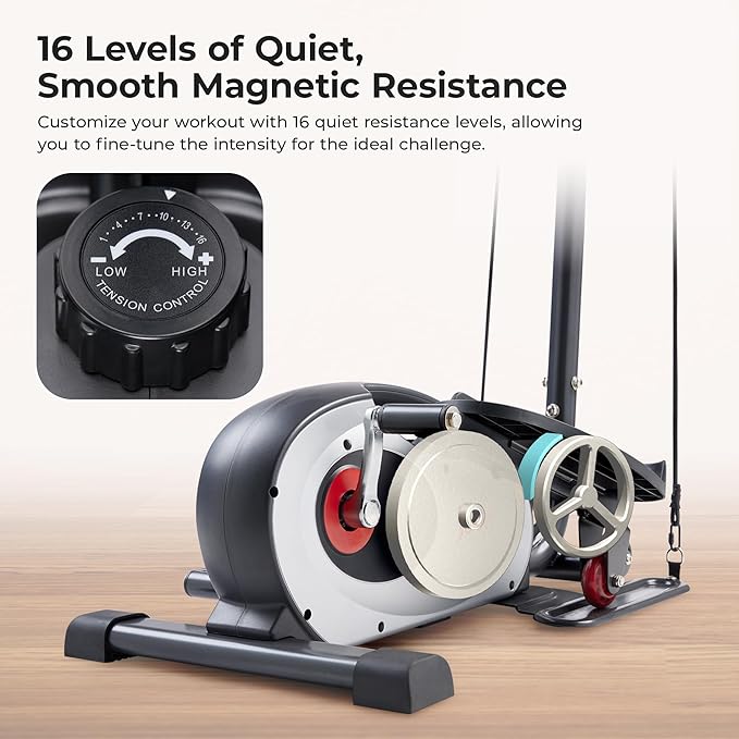 - 【SMOOTH MAGNETIC RESISTANCE】Features 16 levels of quiet, magnetic resistance and an easy-to-use dial, adjusting the intensity of your workout becomes simple. The 7” stride length provides effective exercises within a compact design.