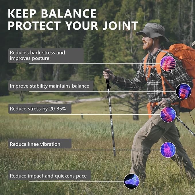 - 【Hiking Poles For Joint Protection】 Provides suitable height options, through the use of hiking poles, can effectively reduce the pressure on the joints of the whole body, so that you can enjoy the fun of hiking and mountaineering.