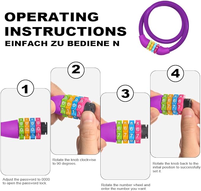 - 【HIGH SECURITY LEVEL PASSWORD LOCK】The bicycle lock password lock cable lock is equipped with a four-digit password lock. The default password is 0000, and 10,000 different combination passwords can be set to improve the safety of the bicycle lock. 4 smooth-running and sturdy number wheels that are kid-friendly and make changing codes quick and easy