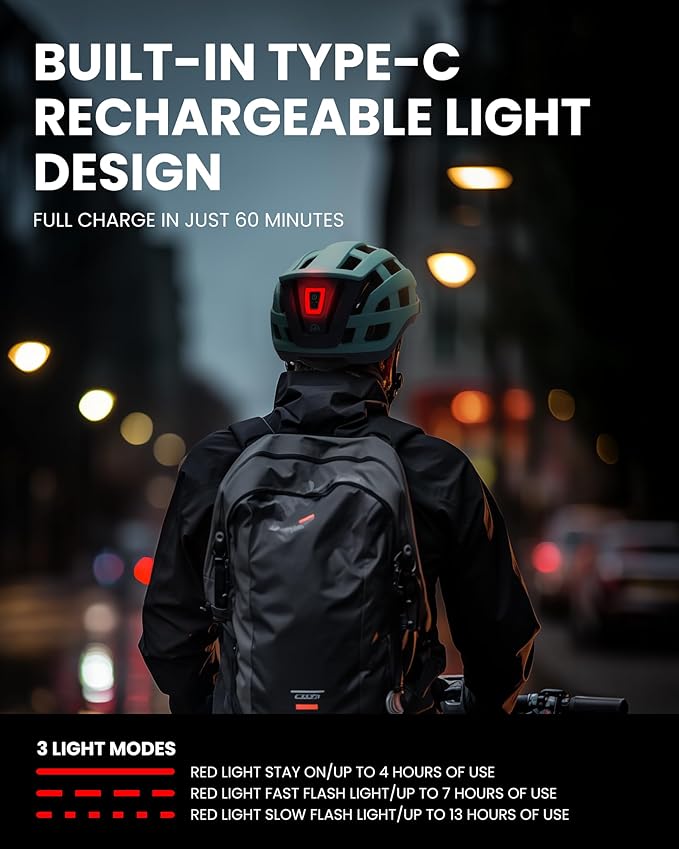 - Rechargeable Helmet Light: The Mips bike helmet included plug-in USB rechargeable LED light, 3 Lighting Modes-steady, fast flashing and slow flashing, will help riders behind you clearly recognized your direction. The bicycle helmet light only takes 60 minutes to charge and can be used for 13 hours