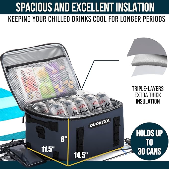 - Spacious And Practical: Measuring 14.5 x 11.5 x 8" and weighing 1.94 lbs, the board cooler can easily fit 30 cans (12 Fl Oz) or 20 cans (16 Fl Oz) of your drinks; Whether you're embarking on a paddle board excursion, a solo touring adventure, enjoying a family picnic, or simply in need of a reliable way to keep your fishing bait and catch cool, our sup cooler bag is the optimal choice for any occasion; The cooler for kayak is also foldablefor easy storage when not in use