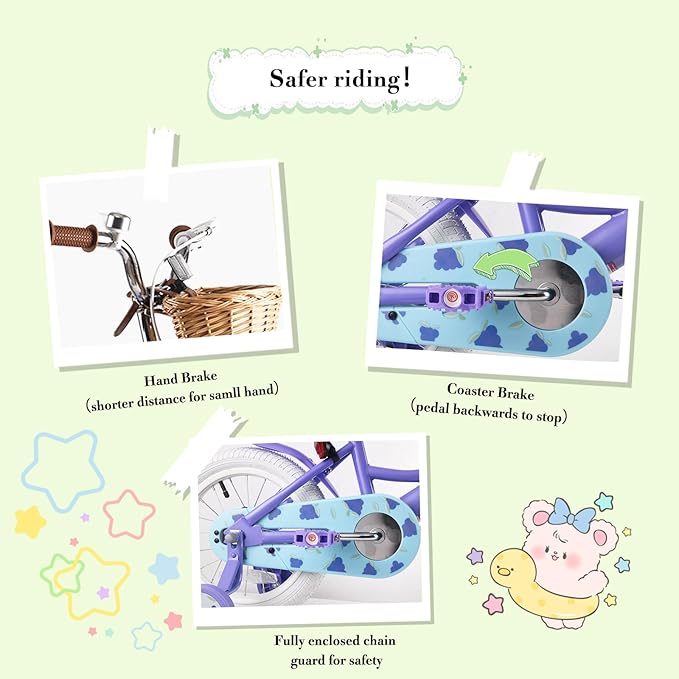 - Amazing Design and Color! Grape Girls bike with Bright colors, stylish and charming. DIY decals, wicker basket and doll bike seat add extra fun to the ride. Adjustable saddle & stem height for a better fit for easy pedalling. Complete with a bell that lets everyone know she's on the move.