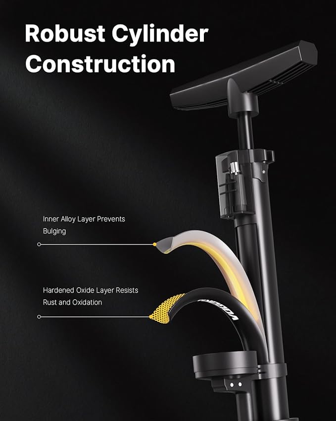 - [Stable Base] - Unlike bases made from contractible steel rods, the VOGORA bike tire pump features a large and thick base that ensures reliability and comfort for users. Its dual base design keeps the cylinder body very stable, preventing any shaking during use. This stability enhances the pump's effectiveness, making inflation smoother and more efficient.