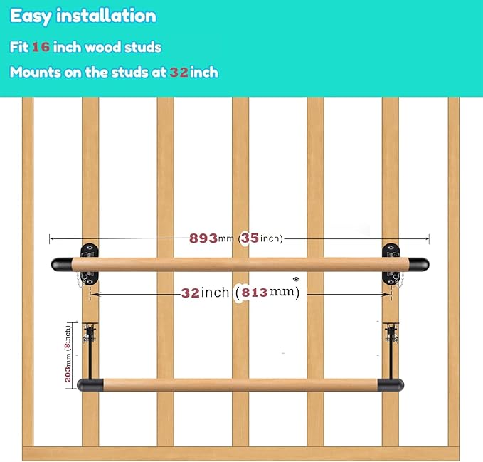 - Dance Bar Size: 35” (2.9ft) in total length and 1.5 ” in diameter, suitable for 16 inch wood studs and can mounts on the studs at 32 inch. The gap between the bar and the wall can be up to 8 inches, giving you enough space to stretch and move.
