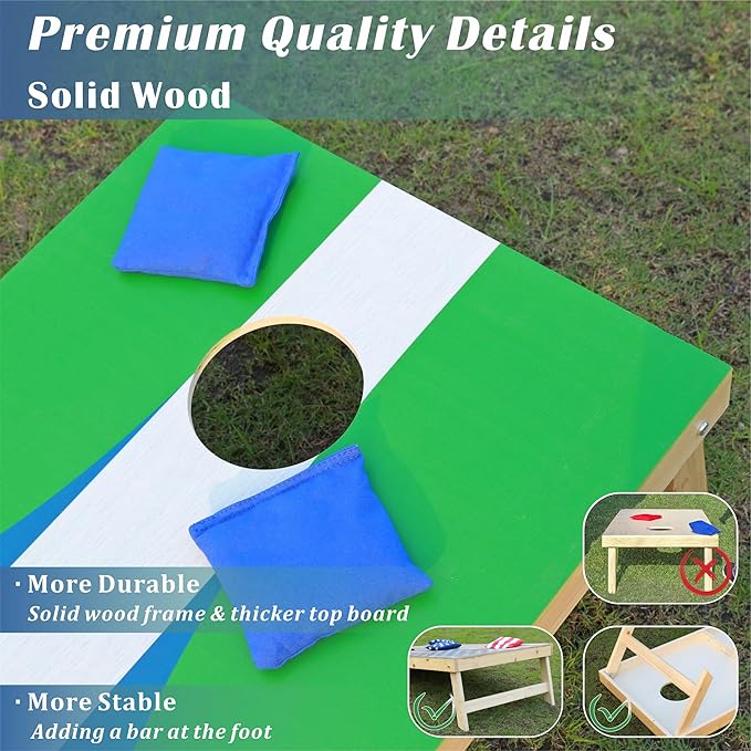 - 【Premium Solid Wood Construction】Our 4’x2’ wooden cornhole board set are made of high quality poplar wood for the top board by 12mm and solid pine wood for the frame, with adding a bar at the foot, our wood cornhole boards are more stable and durable than other thin engineering boards in the market.