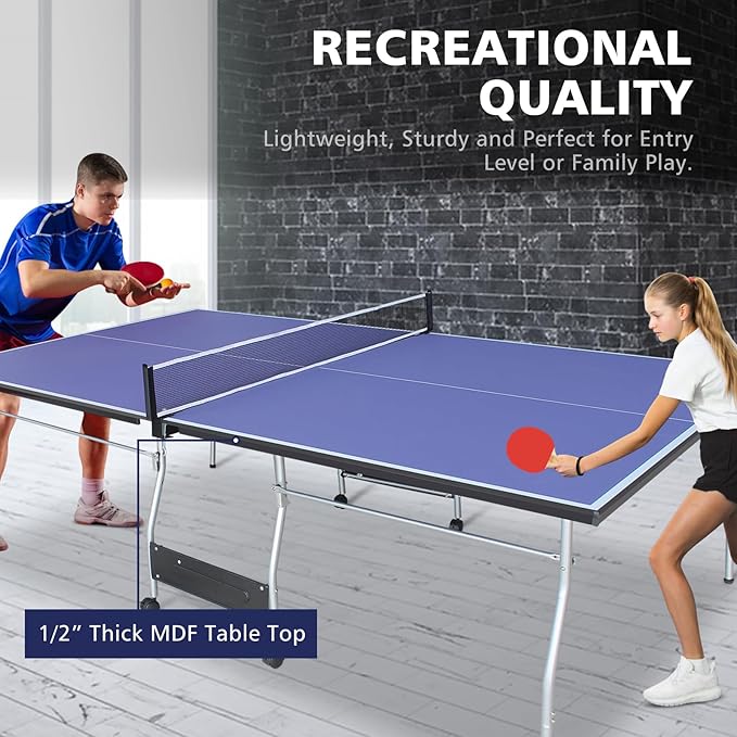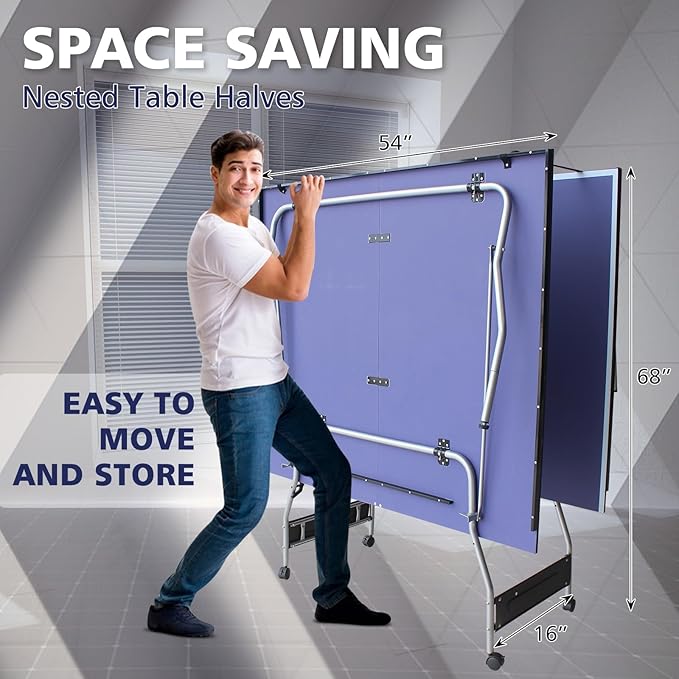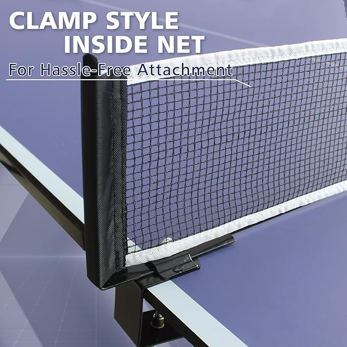 - The 2 halves and 2" lockable wheels and casters makes this ping pong table easy to roll and move around when not in use. Includes net and post set, 2 paddles and 3 balls.