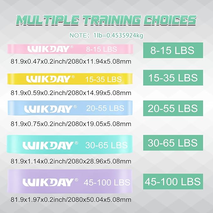- Wide Applications: This professional exercise bands comes with 5 different levels of resistance with a new upgraded door anchor. Pastel pink(8-15 lbs), pastel yellow(15-35 lbs), pastel blue(20-55 lbs), pastel green(30-65 lbs), pastel purple(45-100 lbs). They are very suitable for beginners, fitness enthusiasts, athletes and other people