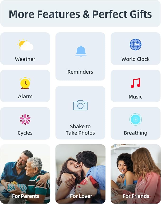 - 【200+ PERSONALIZED WATCH FACES & VERSATILE FEATURES】Unleash your style with 200+ customizable watch faces or upload your own photos—your watch, your personality! This multifunctional smartwatch goes beyond timekeeping, offering alarms, weather updates, music control, stopwatch, timer, camera control, Pomodoro timer, adjustable brightness, event reminders, sedentary and water intake alerts, find-my-phone, raise-to-wake, and more. Stylish, smart, and packed with features, it’s your ultimate companion for a healthier, more connected lifestyle every day!