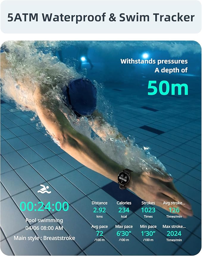 - 【5ATM WATERPROOF SWIMMING WATCH: SMART FITNESS TRACKER FOR POOL & DIVE】Upgrade your training with our 5ATM Waterproof Watch—built for swimming, diving, rainy runs, and workouts. Auto swim stroke detection (butterfly, backstroke, breaststroke, freestyle) with stroke count, frequency, and SWOLF helps fine-tune performance. Pool length options: 25m or 50m. Stylish, durable, and perfect for daily wear. Dive into smarter fitness today!