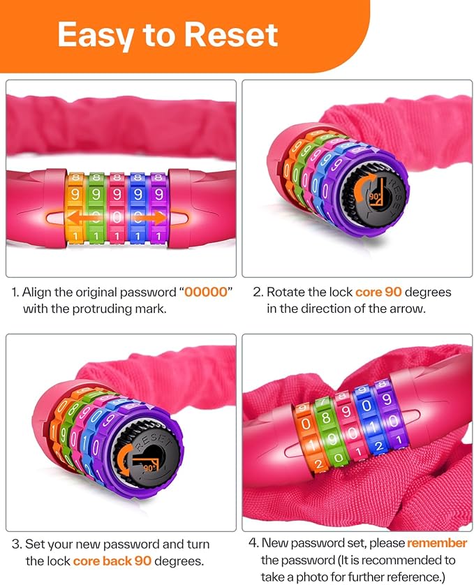 - High Security & Keyless Desig: Say goodbye to the hassle of carrying keys and hello to keyless convenience. The advanced 5-digit combination lock offers unparalleled protection, with up to 100,000 possible combinations, making it virtually impossible to crack. This bike chain lock is the perfect choice for those who value safety and convenience above all else.