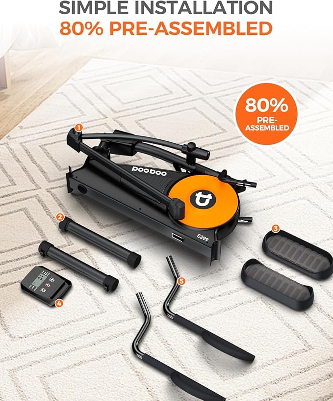 - Warm Tips: The pooboo elliptical machine designed 80% pre-assembled. Say goodbye to the traditional complicated setup process. Guided by the manual or assembly video, you can easily finish it within 30 minutes. Besides, when not in use, it can be quickly and easily folded up