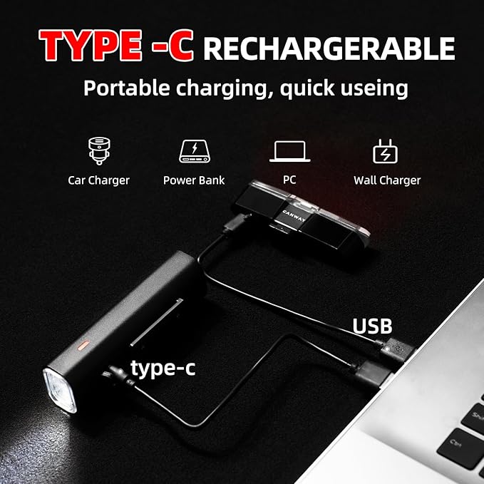 - What You Get: You'll receive 1 x Bicycle Tail Light, 1 x Bicycle Front Light, 2 x Rubber Straps, 1 x Type-C Cable, 1 x USB Cable and 1 x User Manual. Enjoy safe cycling with the Ultra Bright and Durable front rear bike light set