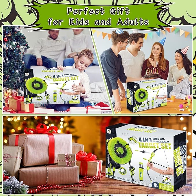 - 4-in-1 Axe Throwing Game Set: The plastic axe throwing set releases the excitement of 4 kinds of throwing, including a bristle target, 3 throwing axes, 3 ninja darts, 6 darts, and a bow and 6 arrows. Aim these at the target, which will be a very exciting game