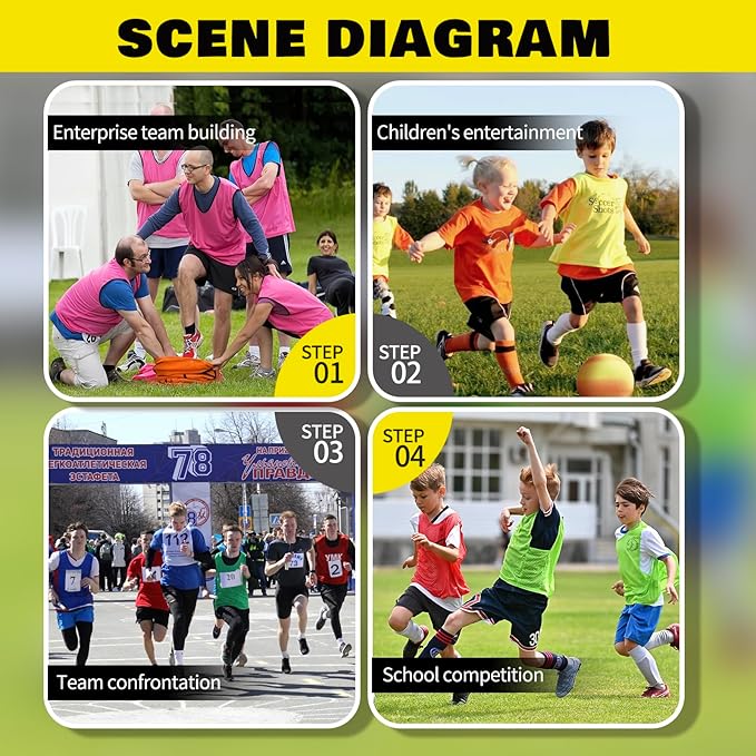 • 【Style Selection】---In order to meet the needs of different groups of people,our soccer training vests offer 4 color combinations(red+blue,yellow+blue,green+orange, red+blue+green+orange)and 3 types of quantity ratio(12pack/24pack/48pack) to choose from.